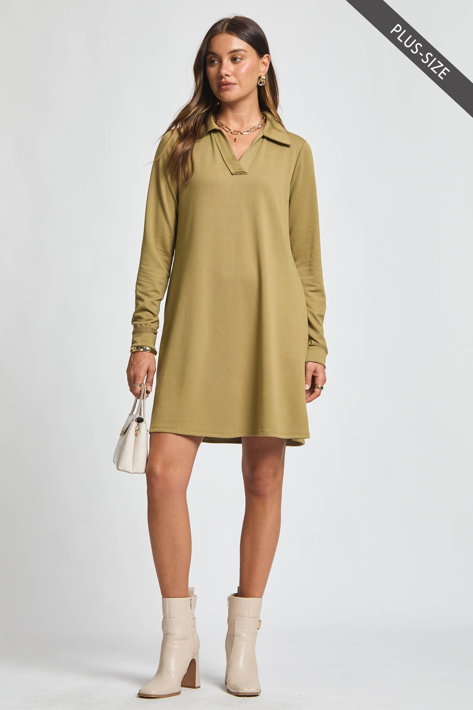 French terry dress that's travel friendly with collar detail and banded sleeves. We love the easy A line silhouette. Knit, stretchy. TRV-ANYWHERE
