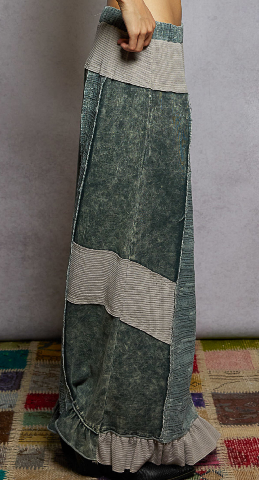 Bring a playful twist to your look with our French Terry Patchwork Pants with Ruffle Hem.