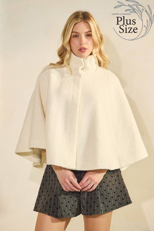 Plus size sleeveless short cape coat with a clasp closure and an adjustable collar.