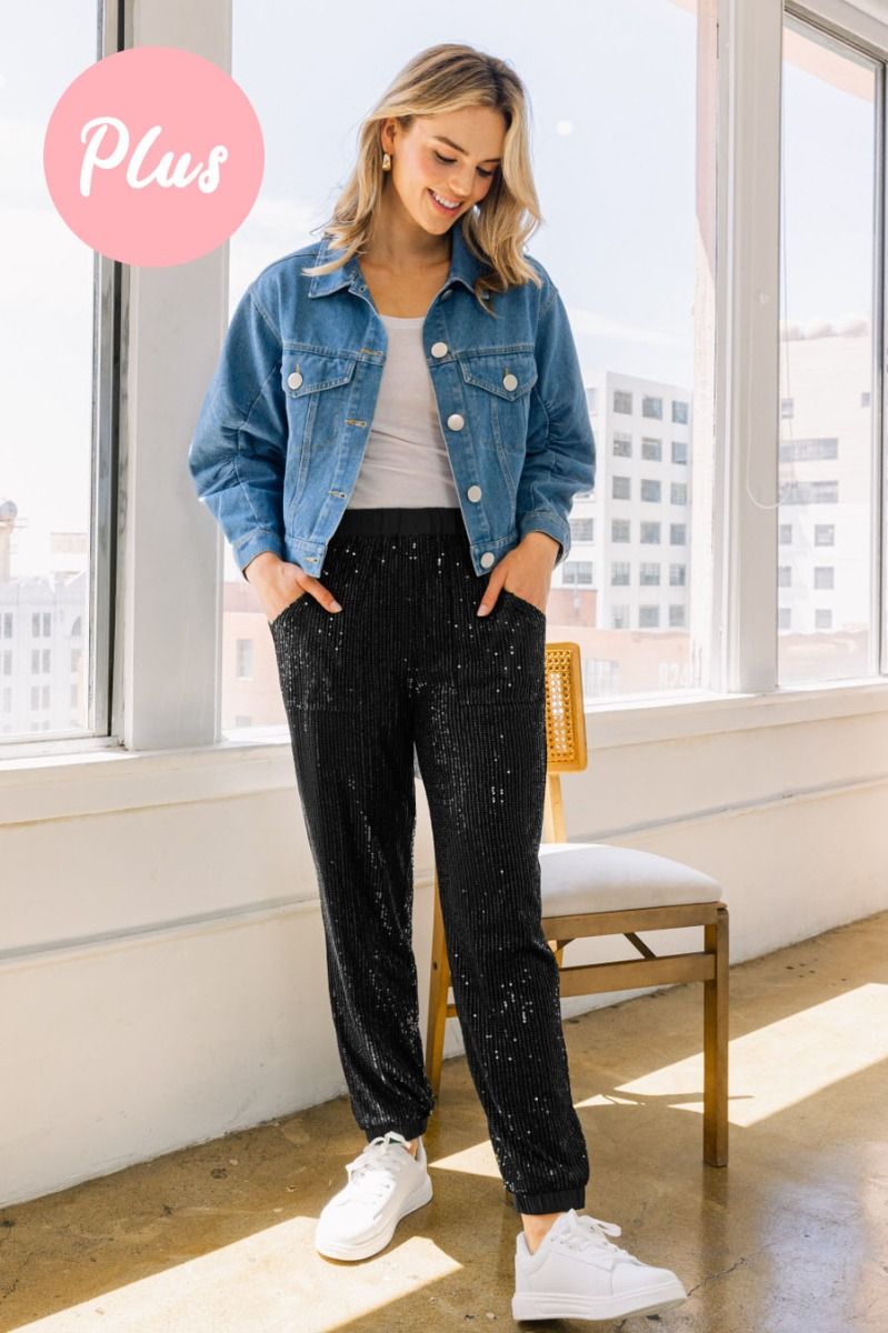 Pocketed sequin jogger pants featuring elastic waistband, elastic leg opening and fully lined.