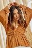 Babydoll satin top with shirring all over the bodice with bell sleeves. V neckline with shorter fit. Non sheer, woven.