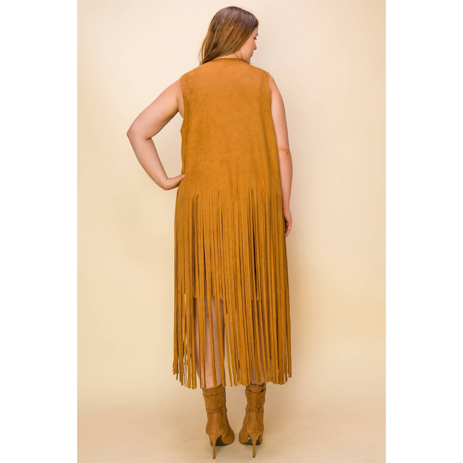 PLUS SIZE SUEDE COWGIRL LONG FRINGE SLEEVELESS CARDIGAN