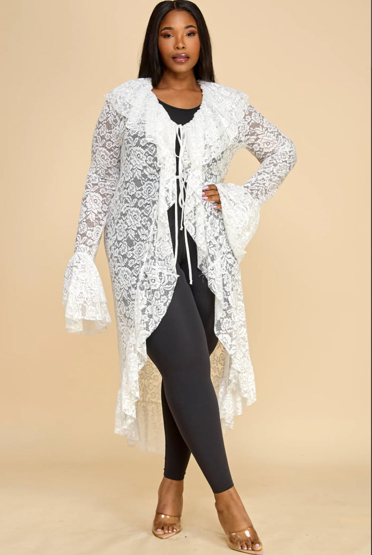 White Long Sleeve Ruffle Detail Lace Cardigan